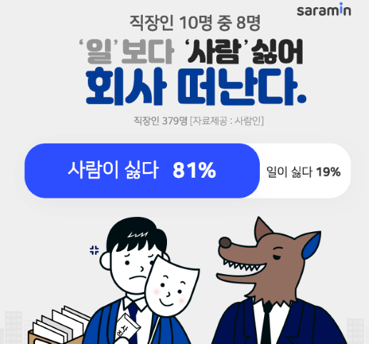 Á÷ÀåÀÎ 10¸í Áß 3¸íÀÌ Á¶Á÷ ³» Àΰ£ °ü°è°¡ ¿øÀÎÀÌ µÇ¾î ȸ»ç¸¦ ±×¸¸µ×´Ù´Â Á¶»ç °á°úÀÔ´Ï´Ù.